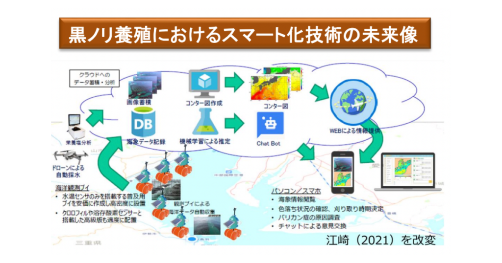 三重県では、クロノリ(黒海苔)養殖の生産管理の高度化に向けたICT活用が進んでいます。三重県水産研究所・鳥羽商船高等専門学校・地元企業が連携し、スマートフォンから海洋環境をリアルタイムで確認できるIoTモニタリングシステム「うみログ」を開発しました。